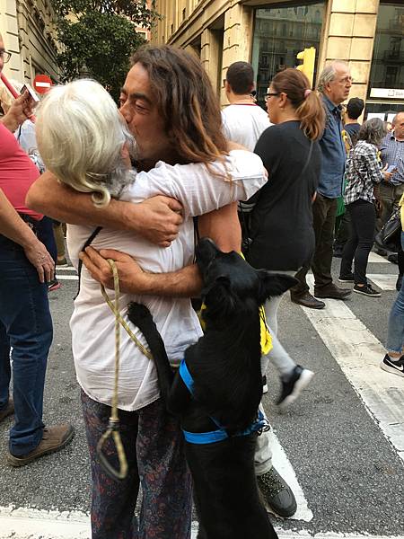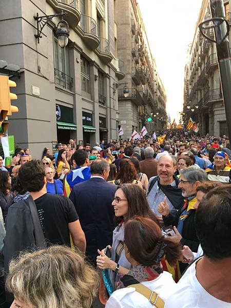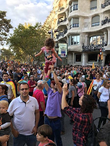 我們是10/21(六)抵達西班牙巴塞隆納,安頓好從住處往外走沒多久就發現好多披著國旗的人從我們身邊經過,遊行氣氛根本很和樂,有老先生牽著老太太,有攜家帶眷的,有一群年輕人,幾乎感覺所有當地人都出來共襄盛舉。